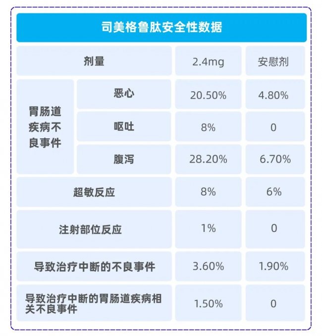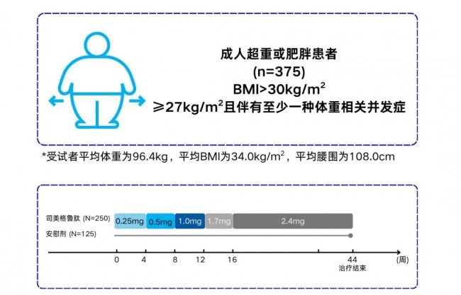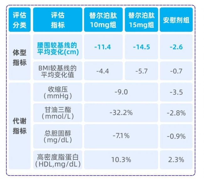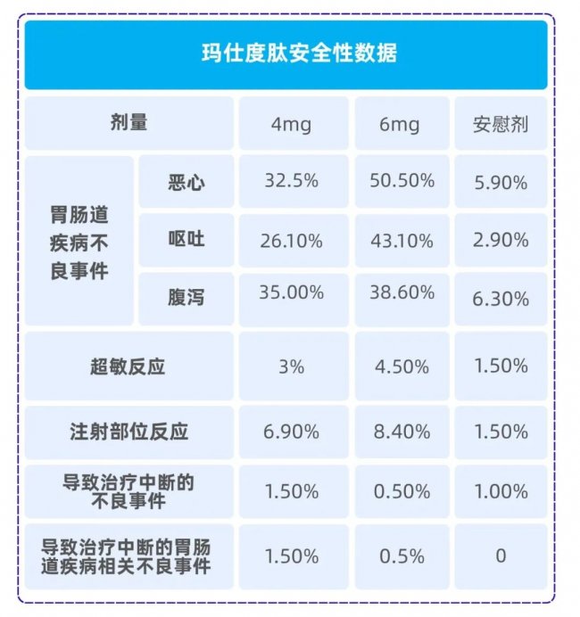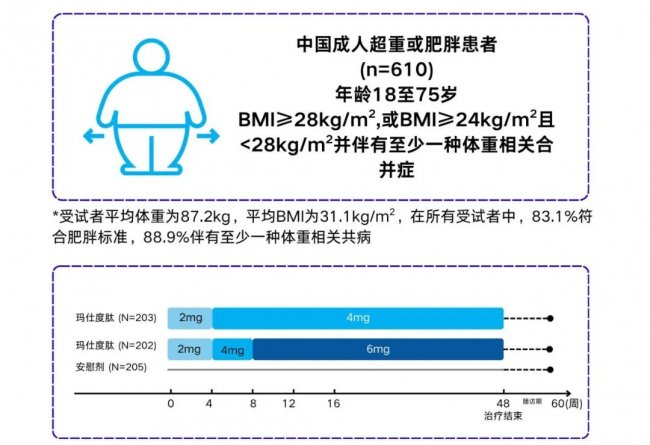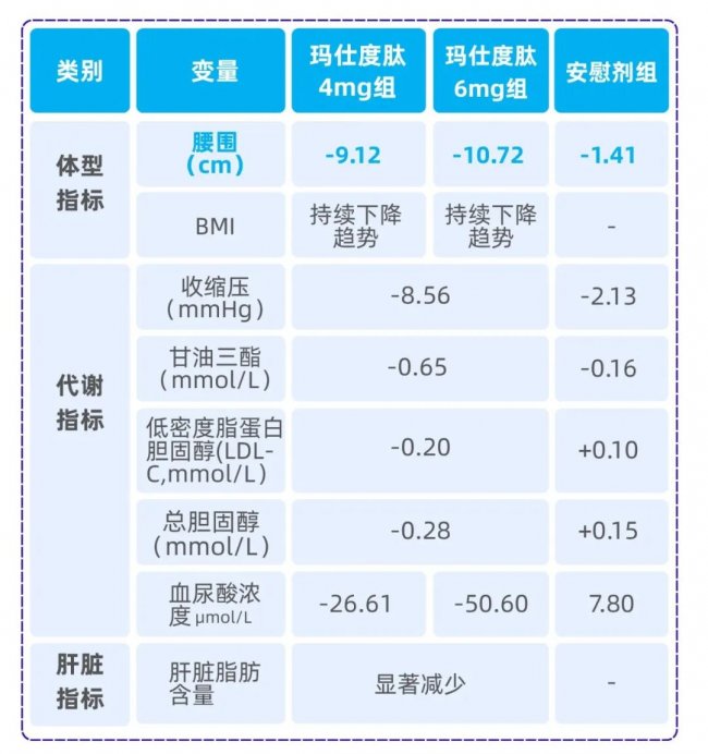玛仕度肽4mg组和安慰剂组受试者体重较基线的平均百分比变化分别为-11.00%和0.30%。