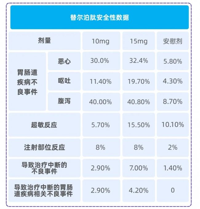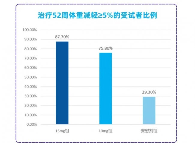 在第52周,替尔泊肽10mg组减重≥10%的比例为64.1%,15mg组(该剂量国内未获批)为71.9%,安慰剂组为14.5%;减重≥15%的比例替尔泊肽10mg组为46.4%,15mg组(该剂量国内未获批)为61.4%,安慰剂组为2.9%。