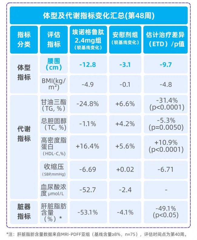 治疗48周,埃诺格鲁肽体型指标与其他代谢改善