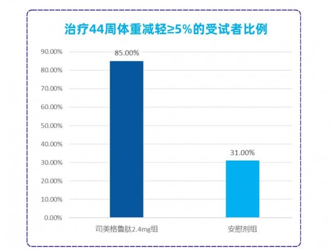 治疗44周,司美格鲁肽2.4mg组85%患者体重达标(体重减轻≥5%)