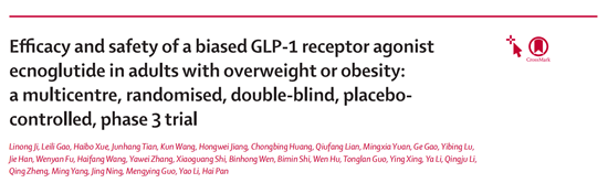 4.Ji L, Gao L, et al. Efficacy and safety of a biased GLP-1 receptor agonist ecnoglutide in adults with overweight or obesity: a multicentre, randomised, double-blind, placebo-controlled, phase 3 trial. Lancet Diabetes Endocrinol. 2025 Sep;13(9):777-789.
