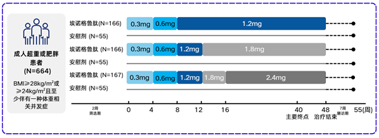 SLIMMER研究是一项由北京大学人民医院纪立农教授牵头,在中国36家医院进行的随机、双盲、安慰剂对照3期试验,纳入664例超重或肥胖患者,随机 (3:3:3:1:1:1) 接受埃诺格鲁肽1.2mg、1.8mg、2.4mg或药量匹配安慰剂(1.2mg、1.8mg、2.4mg)治疗,旨在评估埃诺格鲁肽相比安慰剂治疗超重或肥胖的疗效与安全性,为中国超重/肥胖非糖尿病成人的临床治疗提供了高级别、本土化的循证医学证据[4]。