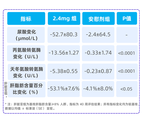 埃诺格鲁肽 2.4mg 组尿酸较基线降低52.7μmol/L,高尿酸血症发生率为10%,低于安慰剂组的 19%[4]。同时,埃诺格鲁肽2.4mg组的肝功能指标改善尤为亮眼,丙氨酸转氨酶(ALT)、天冬氨酸转氨酶(AST)均显著下降[4]。