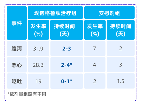 腹泻、恶心、呕吐这类胃肠道不良事件的中位持续时间也较短,与安慰剂组相似[4]。