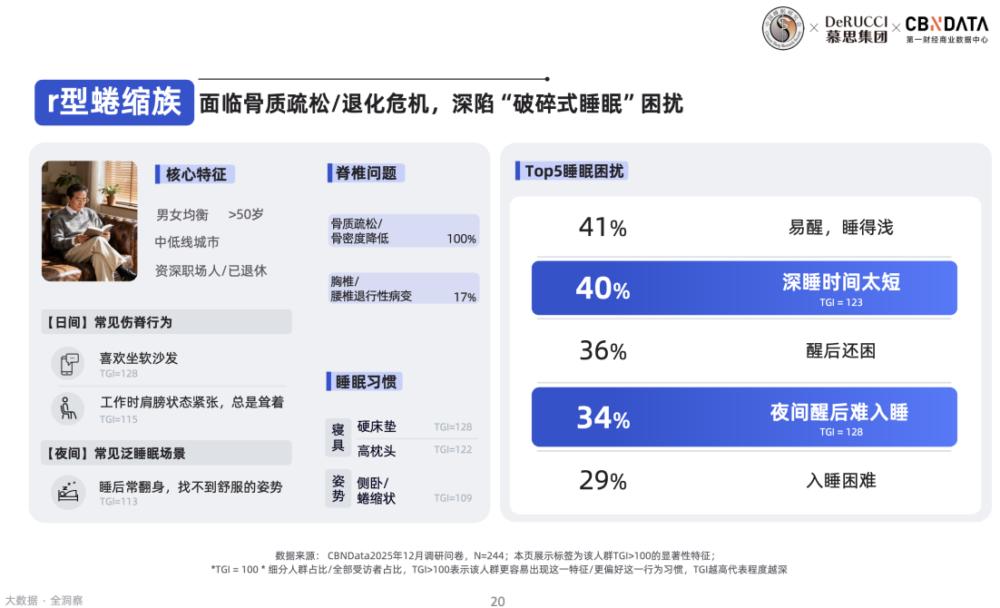 对于50岁以上的人群而言,r型蜷缩是更为典型的一种脊椎受损形态,这一方面受骨质疏松的影响,另一方面也与生活习惯息息相关,比如喜欢坐软沙发、长期肩膀紧张耸立等。这类人群的首要睡眠痛点是易醒,而深睡时间短、醒后难入眠是相较其他人群更为突出的两大困恼。