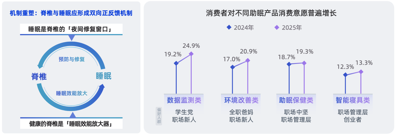 以睡眠质量和脊椎健康的相互作用机制为例,在影响睡眠的前三大干扰因素类型中(脊椎、行为、心理),脊椎是相对更为可控的变量,而睡眠期又是脊椎物理复原的黄金窗口,由此共同构筑了“双向赋能”的正向循环机制。与此同时,睡眠也被视为需主动管理的“生产力工具”,超七成受访者愿意增加睡眠投入,在这一过程中,消费者对数据检测类、环境改善类、助眠保健类和智能寝具类产品都有着不同程度的增投意愿。其中,能够为脊椎提供科学支撑的寝具成为启动“睡眠-脊椎”这一正向循环的关键。