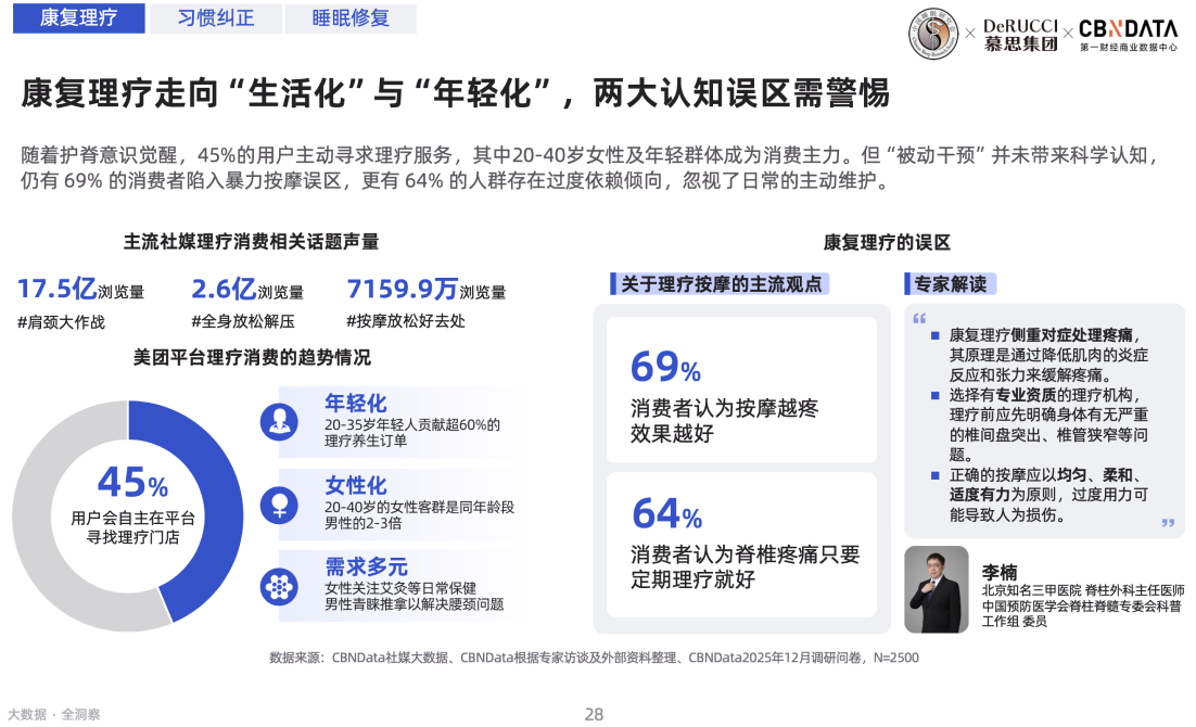 对于日间康复理疗而言,“生活化”和“年轻化”是当前两大核心趋势。值得注意的是,当前消费者理疗存在两大认知误区:其一在于过度依赖理疗这种“被动干预”,实际上理疗只是辅助脊椎健康的手段之一;其二在于对理疗力度的偏好,认为按摩越疼越好,北京知名三甲医院脊柱外科主任医师李楠在接受访谈时表示:“正确的按摩应以均匀、柔和、适度有力为原则,过度用力可能导致人为损伤”。