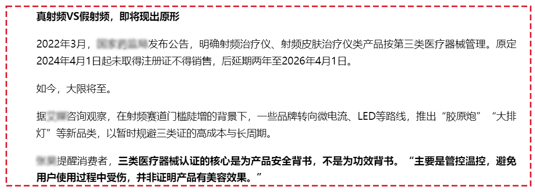 2022年3月,国家药监局发布公告,明确射频治疗仪、射频皮肤治疗仪类产品按第三类医疗器械管理。原定2024年4月1日起未取得注册证不得销售,后延期两年至2026年4月1日。如今大限将至,一些品牌转向微电流、LED等路线,推出新品类以暂时规避三类证的高成本与长周期。据发文媒体报道,截至2026年2月,仅有12家品牌完成了射频皮肤治疗仪的注册。