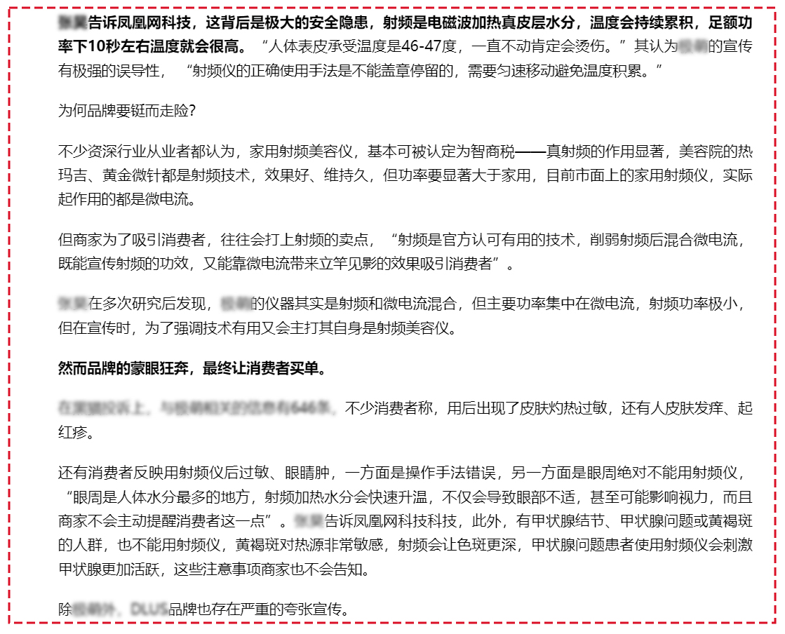 在操作手法和适用人群宣传上,品牌方同样误导消费者,如某平台官方旗舰店推荐的“盖章”使用手法存在极大安全隐患,射频加热会使温度持续累积,人体表皮承受温度有限,“盖章”停留极易烫伤,同时眼周、有甲状腺结节、甲状腺问题或黄褐斑的人群不能使用射频仪,商家却未主动提醒;还有些品牌推荐不使用凝胶,而凝胶核心作用是散热,不用凝胶会导致皮肤烫伤、仪器滑动不便、能量传导不畅,这种宣传会误导消费者在使用其他合规射频仪时也不涂凝胶,进而造成烫伤。