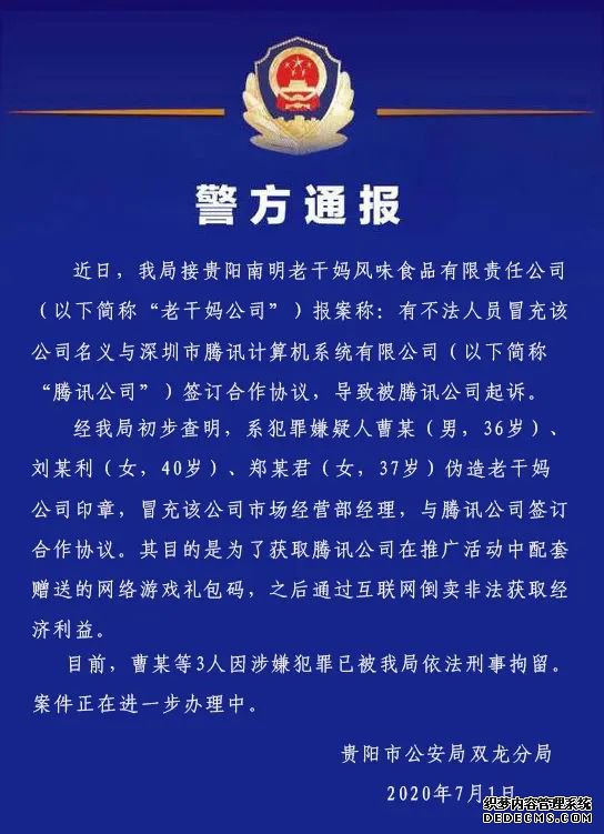 经该局初步査明,系犯罪嫌疑人曹某(男,36岁)刘某利(女,40岁)、郑某君(女,37岁)伪造老干妈公司印章,冒充该公司市场经营部经理,与腾讯公司签订合作协议。其目的是为了获取腾讯公司在推广活动中配套赠送的网络游戏礼包码,之后通过互联网倒卖非法获取经济利益。