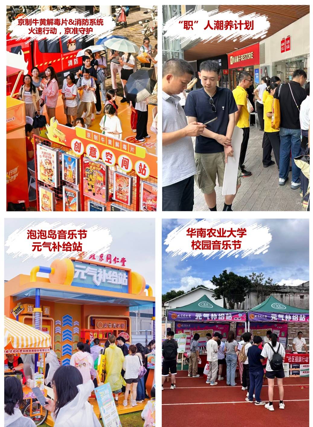 本次活动突破传统终端营销模式,采用多场景联动模式创新,实现从社区到校园、从音乐节到大厂企业的全域渗透。构建起覆盖职场人群、高校学生、年轻乐迷、社区居民等多元客群的立体沟通网络。在泡泡岛音乐与艺术节现场,北京同仁堂打造"元气补给站"主题快闪,以沉浸式体验与年轻群体深度互动,实现品牌曝光超500万+;走进深圳创维科技园区,开展职场健康专场活动,将中医药关怀送达企业员工;联动华南农业大学校园音乐节,结合"百团大战"市集设立元气补给站,吸引超1.8万新生围观,实现与Z世代的深度链接;同时,京制牛黄解毒片携手消防系统发起"火速行动,京准守护"主题公益行动,以创新形式传递健康理念,并通过举办高校公益绘画联赛及校园快闪活动,将健康科普与青春创意深度融合,深度影响广州高校生超3万,实现2700万品牌曝光,在校园场景中构建了与年轻群体的深度连接。这一系列精准的场景布局,展现了北京同仁堂对当代消费者需求的深刻洞察。