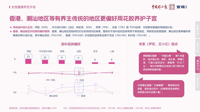 毋庸置疑,这与地域文化传统息息相关。调研发现,尽管时代飞速发展,阿胶、燕窝、花胶等传统滋补品仍然占据养宫主流,尤其在香港和潮汕,女性对花胶的选择率大大高于内陆地区。